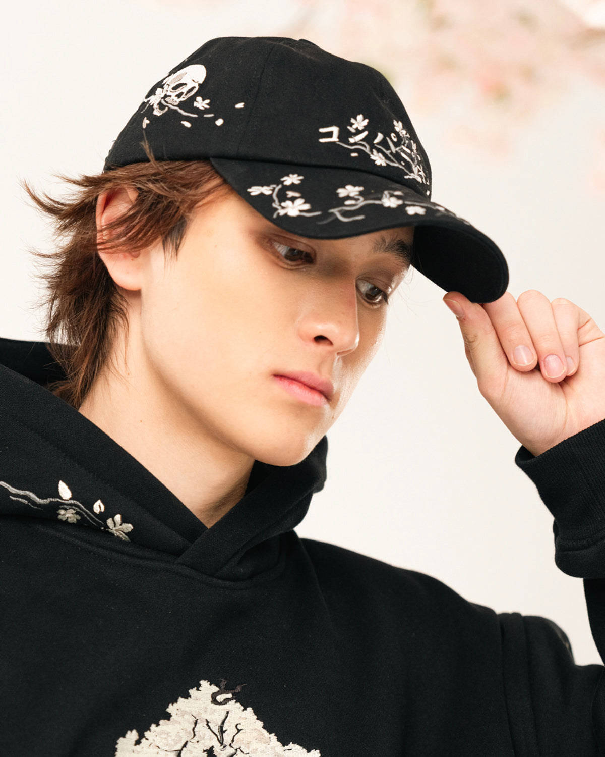 • Custom 6 Panel Cap with All Over Skull Blossom Embroidery